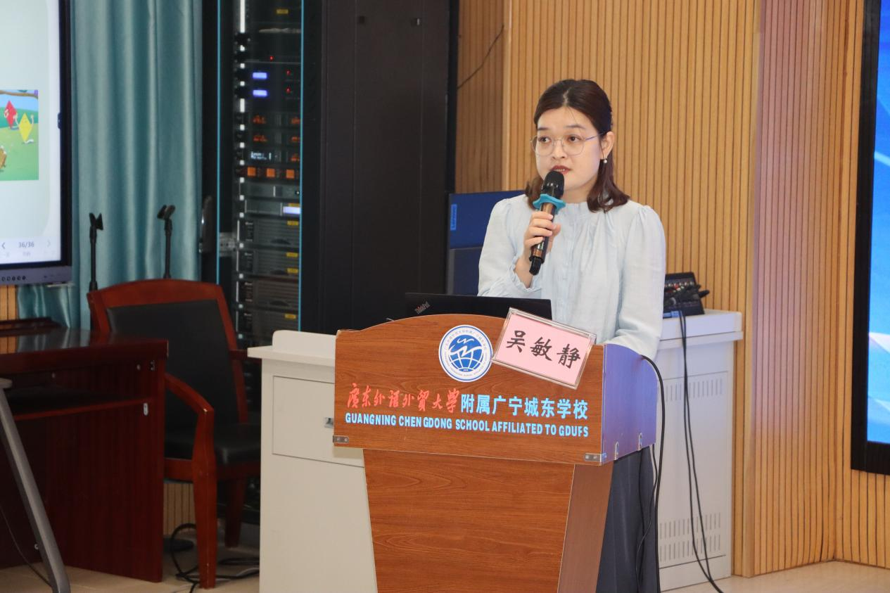 封开县教师发展中心副主任,小学英语教研员黄晨晖老师对吴敏静老师的课进行点评,她充分肯定吴老师通过绘本把语音发音规则融入真实情境,避免枯燥拼读,让语音学习有情景、有温度。由浅入深地深挖了肇庆新课堂素养的内涵,引导老师们如何在语音教学设计中完成有效的语言输出。