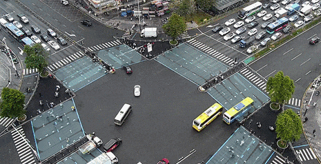 ▶改造前:右转盲区较大、畸形路口过街不便。
