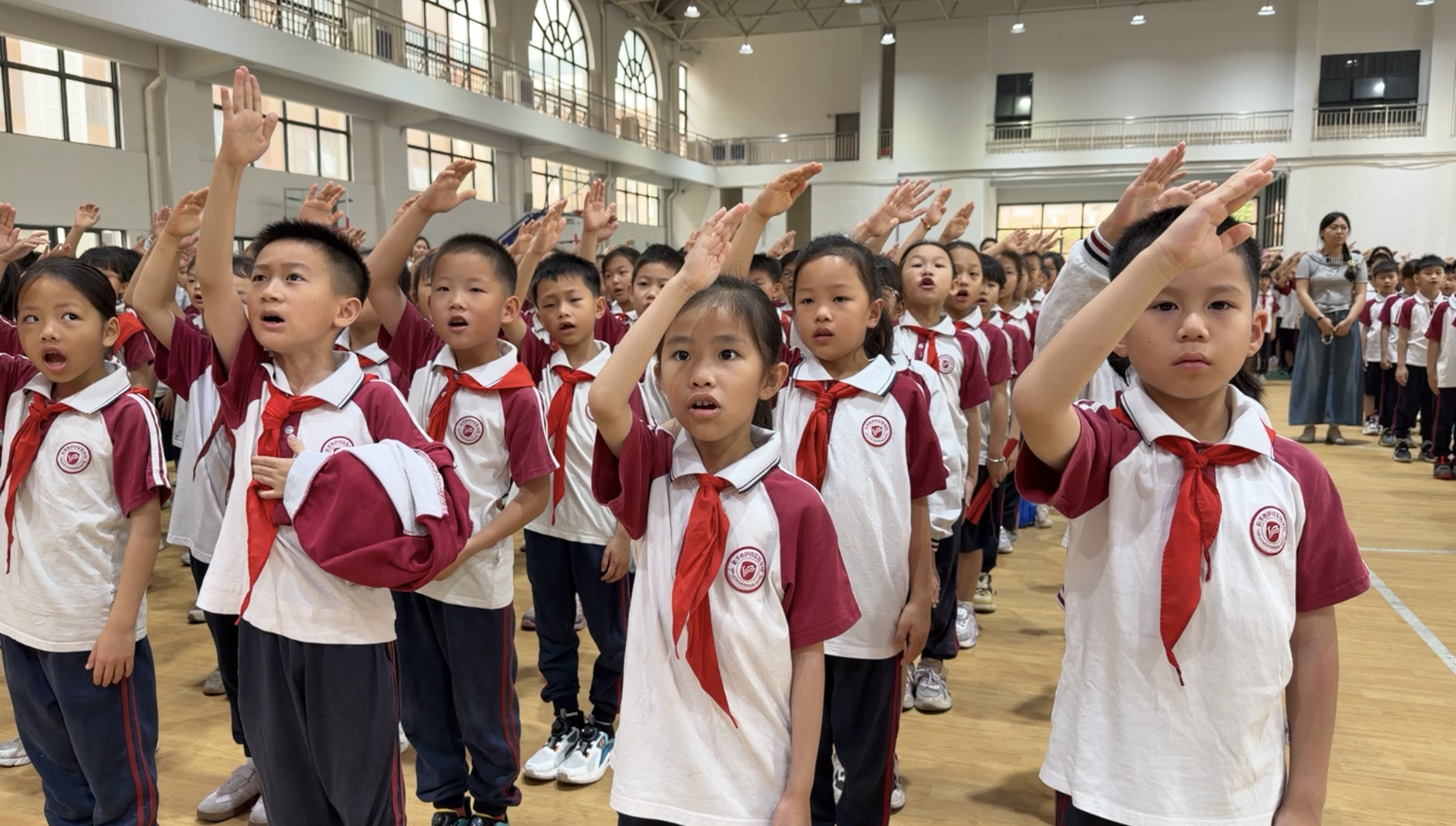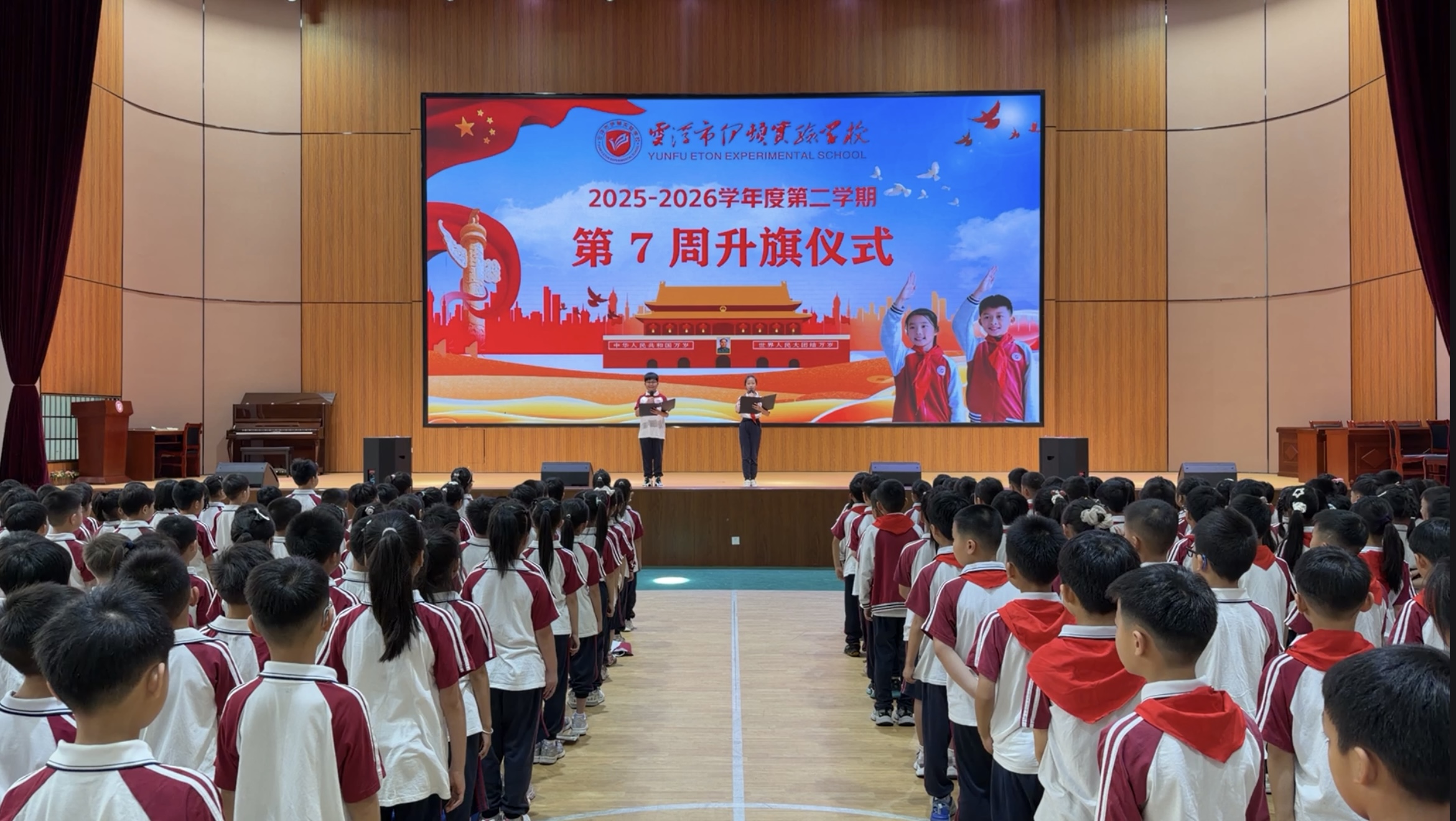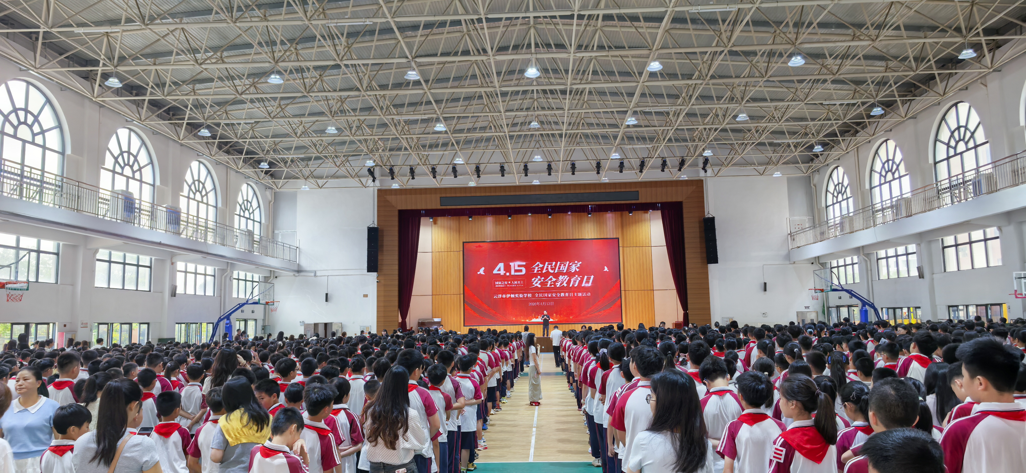 4月13日清晨,云浮市伊顿实验学校体育艺术中心内,小学部全体师生整齐列队,举行庄严的升旗仪式。仪式上,小学部负责人发表国旗下讲话,紧扣政治安全、网络安全、生态安全及社会安全等内容,深刻阐释国家安全观的内涵与外延,号召全体师生从日常点滴做起,将“国家安全、人人有责”的理念内化于心、外化于行,激发青少年守护国家安全的使命感和责任感。
