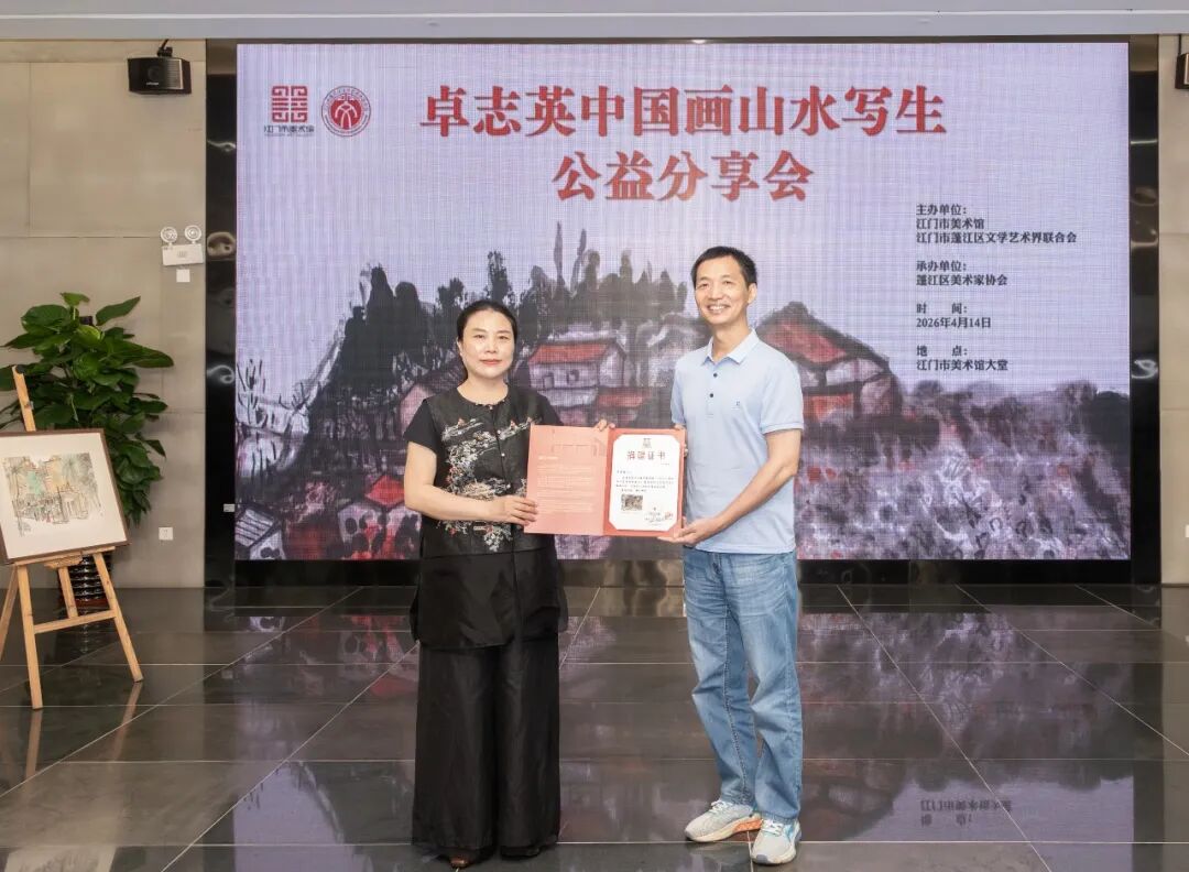 分享会尾声,举行了捐赠仪式。为支持江门市美术馆的公共收藏事业,卓志英女士将其精心创作的国画作品《岱庙写生》无偿捐赠给江门市美术馆。江门市美术馆副馆长潘景全代表接收作品并向卓志英女士颁发收藏证书。此次捐赠不仅丰富了江门市美术馆的近现代美术藏品体系,更生动诠释了跨地域艺术家对五邑文化热土的真诚回馈与深情守望,为我市美术事业的发展注入了温暖而坚实的力量。