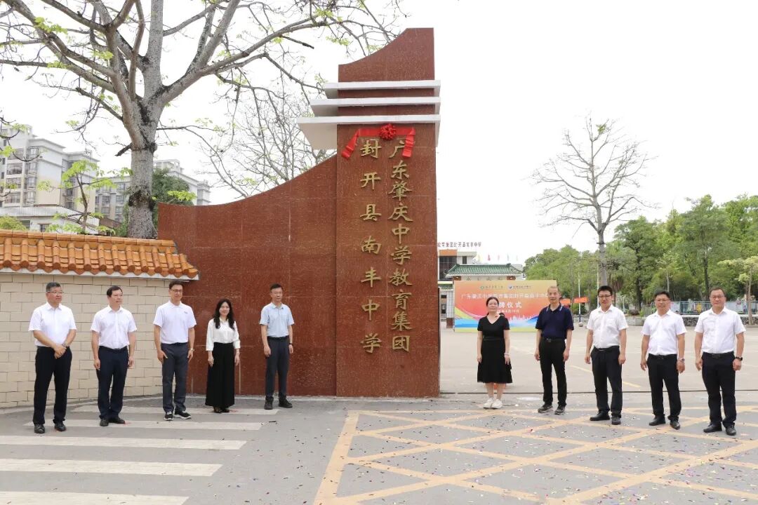 肇庆市教育局党组成员、副局长黎惠娴,广东肇庆中学党委书记陈淑玲、校长杨荣,广东省教育学会副会长、肇庆市乡村教育工作室主持人彭银祥(广东肇庆中学原校长),封开县委书记李亚旭、县委常委陈丰伟等共同出席仪式并为广东肇庆中学教育集团封开县南丰中学揭牌。