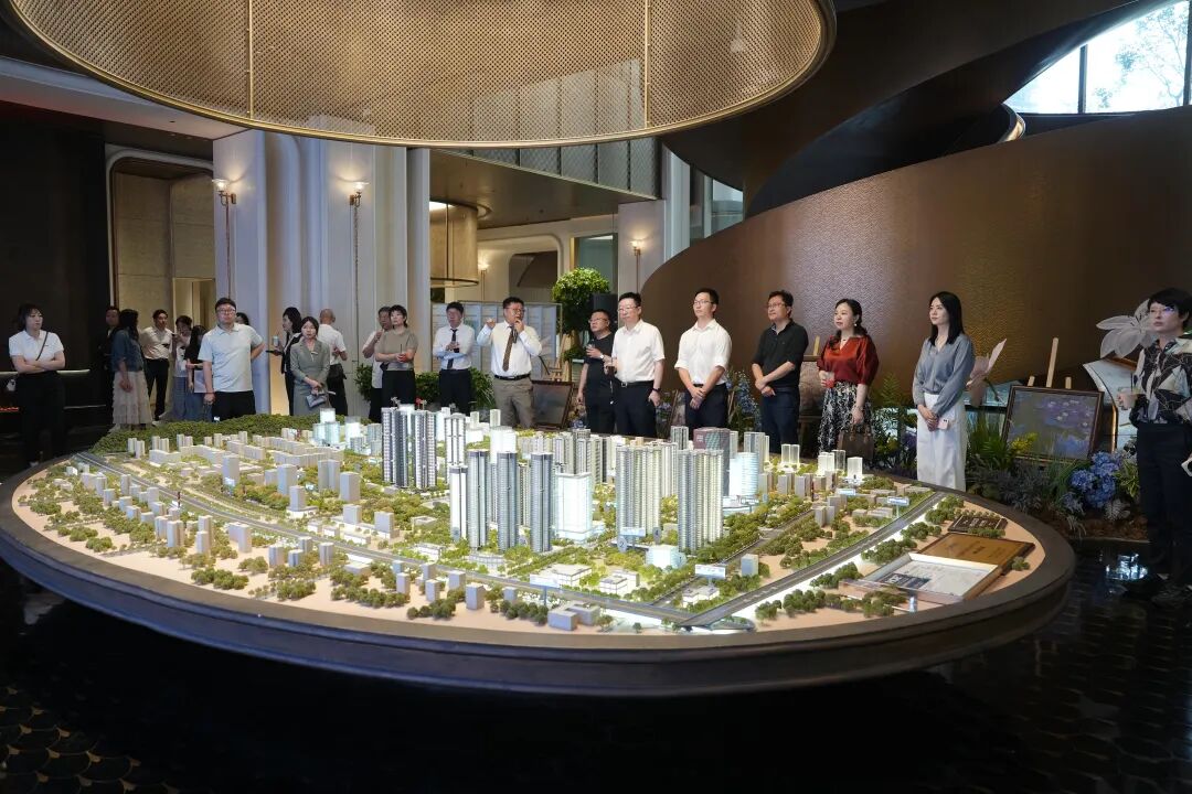 抵达项目后,双方代表团在专业讲解员的引导下步入营销中心,于项目全景沙盘前观摩。中建·白云之星由世界500强企业中国建筑旗下优秀排头兵中建三局携⼿白云城市发展集团联合投资开发建设,是粤港澳大湾区首个“中建之星”系列地标作品。自入市以来,项目持续获得市场认可,2026年一季度实现销售80套,位居区域销冠,在当前行业调整周期中展现出稳健的产品竞争力。代表团了解到,“中建之星”自2016年从宜昌起步,先后落子多个城市,形成了以城市地标为特征的高端住宅开发体系。作为该系列首进大湾区的作品,白云之星以择址、产品、高配、定制、圈层五大维度集成顶级资源,致力打造不断精进的城市恒产范本。