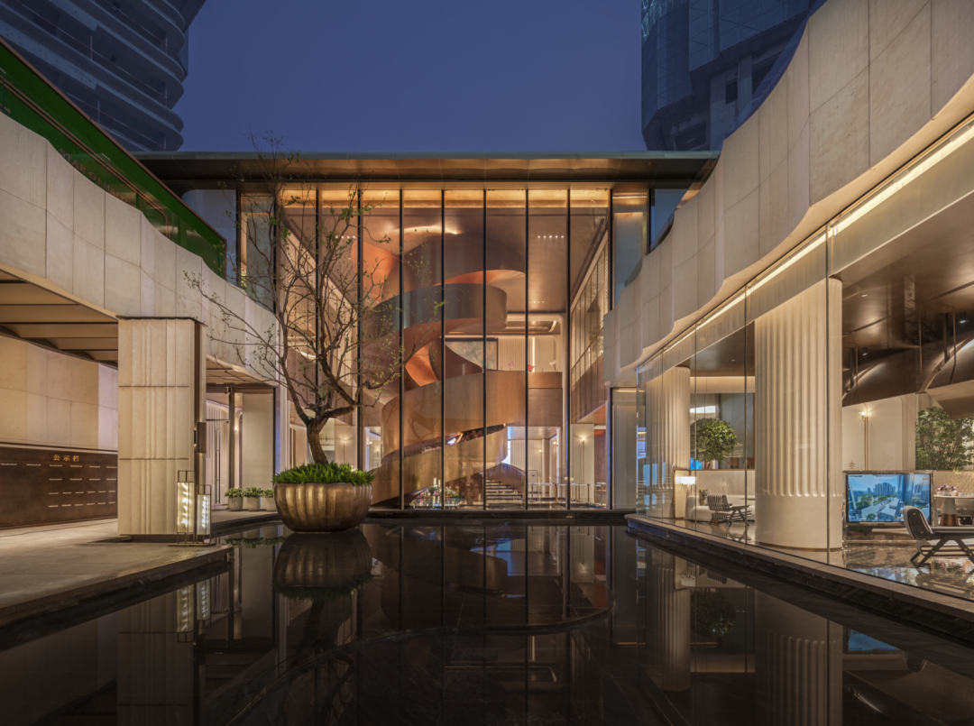 从公园往建筑方向看,项目的外立面采用曲线流体设计,无柱转角的弧形窗配上铝板和low-e玻璃幕墙,实现了270度的环幕视野。园区内,规划五大主题架空层泛会所——科普体验、共享书吧、礼宾会客、康养娱乐、儿童游乐各安其位。云中图书馆已开放,超过6000册图书可以借阅。下沉艺术空间里还有瑜伽室、健身房和私宴厅,为未来业主的社交、运动和休闲预留了充足空间。这些空间的背后,是四家国际顶尖设计团队的联手——上海天华负责规划,JTL加特林执笔园林,CCD郑忠团队操刀下沉艺术空间设计,中国美院宋建明教授主导色彩设计。从建筑轮廓到室内光影,从园林植被到空间色调,细节中都透露着设计大师的考量。