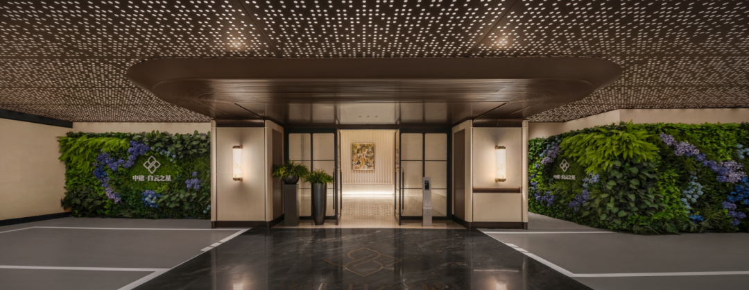 沿着归家动线深入,代表团沉浸式体验了项目精心营造的归家三重礼序。第一重是约55米的奢阔门楼,豪华酒店环岛式落客区铺展开来,幻彩釉面陶板与天然石材交错拼接,五种定制色彩呼应着传统门楼“多色象征吉祥”的文化意蕴。步入其内,第二重约9.5米奢石入户大堂迎面而至,地面拼花提取自黄边艺术公园的睡莲形态,艺术格调与归家仪式感在此交融。下行至地下空间,第三重星空穹顶车马厅以酒店式精装标准呈现——贝金米黄石材墙面、莫奈元素拼花石材地面、全弧形吊顶天花,在细节处透出用心。