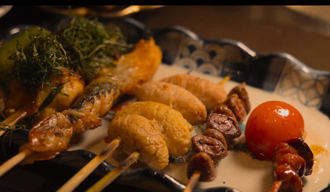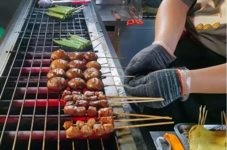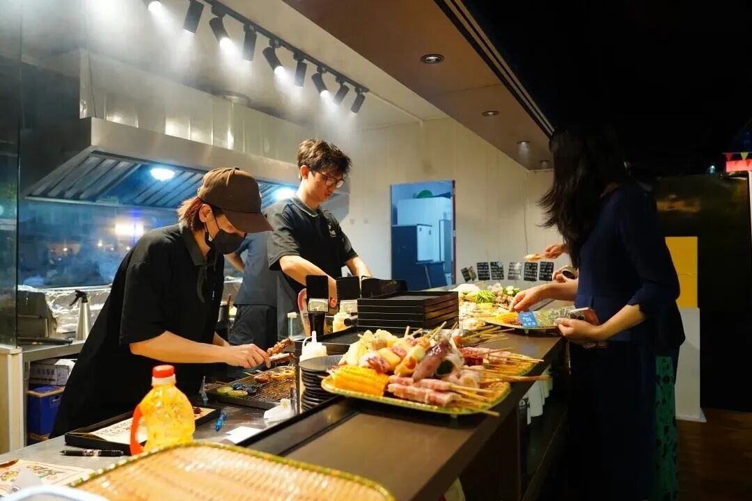 烧烤店靠着老板亲手调制的广式蜜汁烧烤而闻名,咸香中带着一丝淡淡的蜜糖甜味,烤串们临上盘前还会撒上一把厚实的白芝麻增加香气。