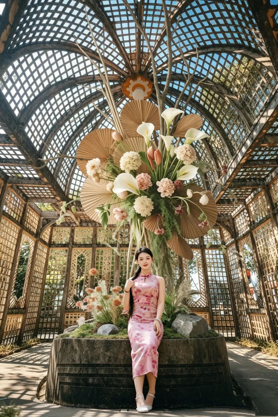 花藤亭:西式皇冠顶下,融入一棵以非遗葵艺纯手工编织而成3米高的艺术树——葵为叶、花为缀,还原树木自然生长的灵动姿态,传统匠心与自然之美在此交融。