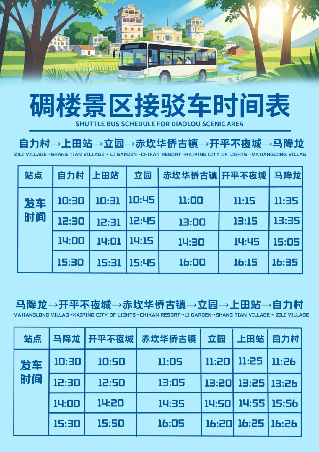 • 乘坐高铁至 开平南站,出站后打车或乘坐公交前往各景区(立园/自力村/马降龙),车程约20-30分钟。