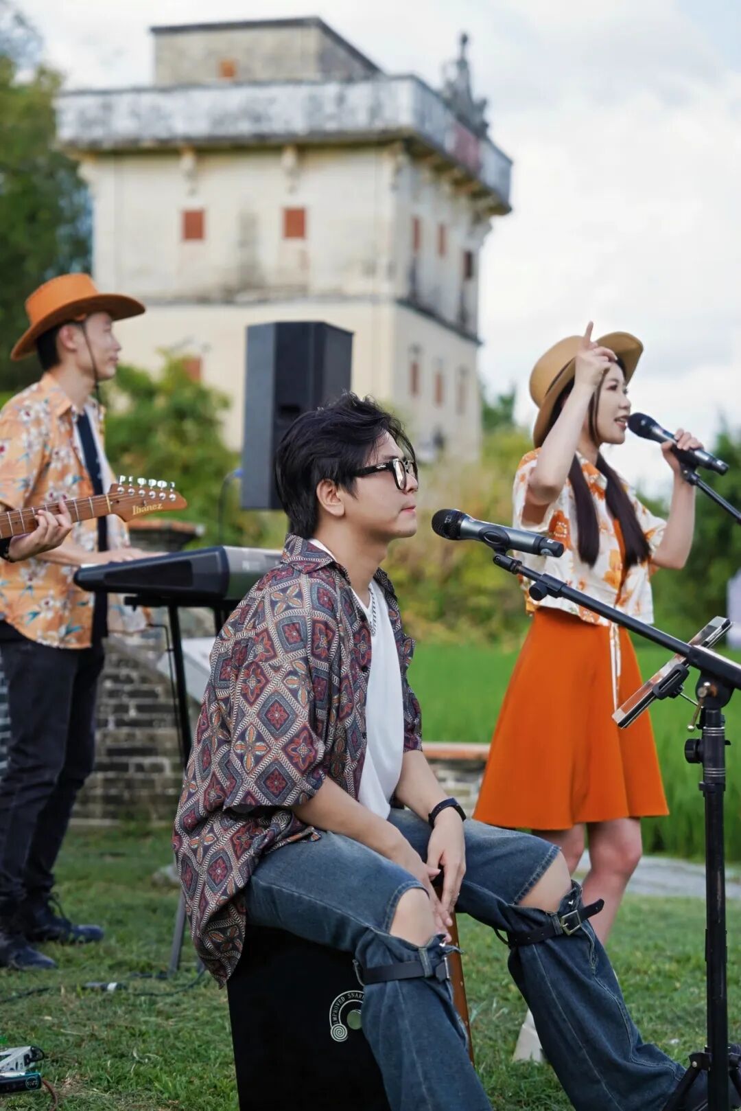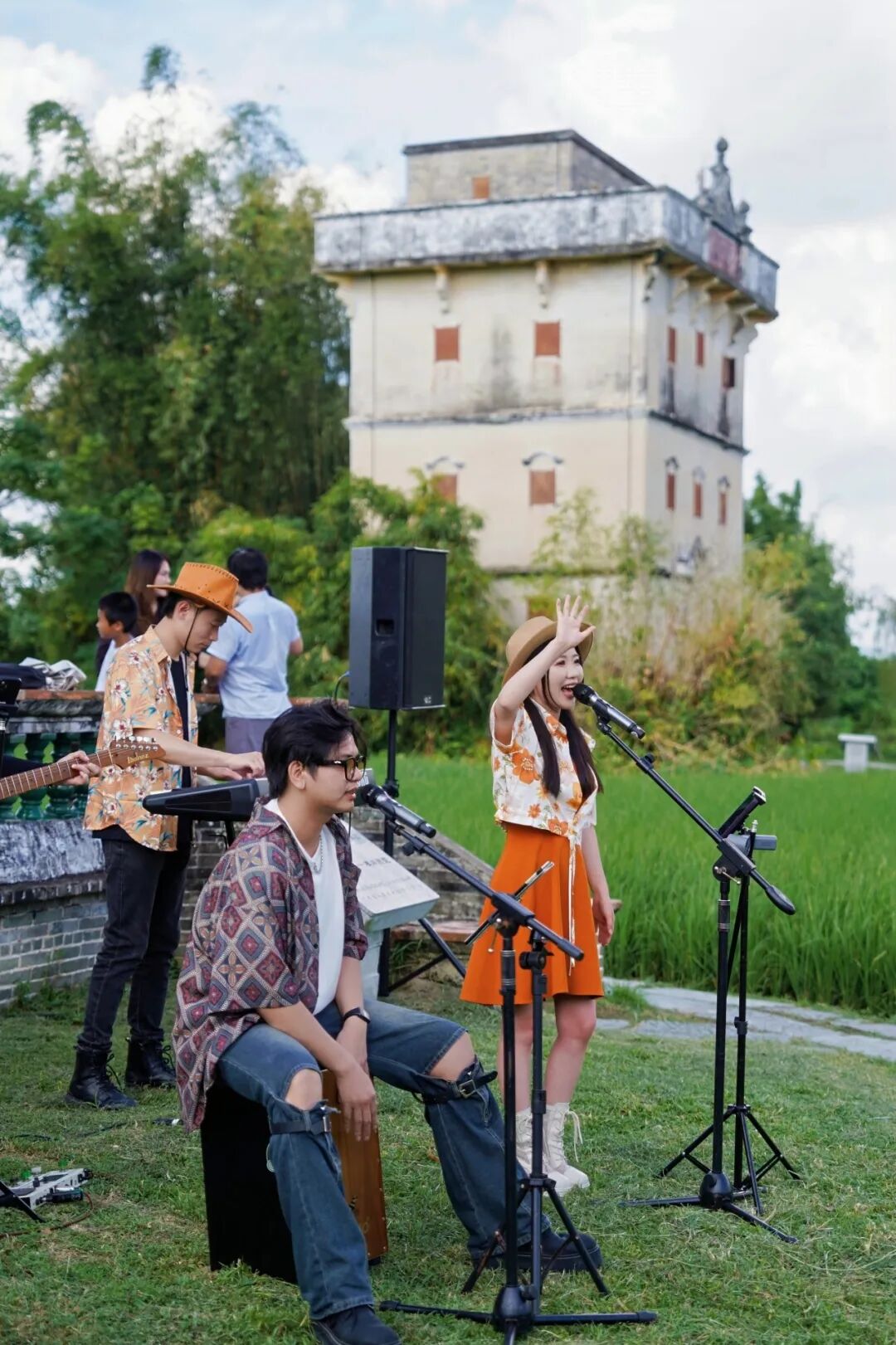 乐队现场弹唱,曲目涵盖侨乡民谣、华侨怀旧金曲。坐在田埂草垛上静静聆听,或跟着节奏在稻香中摇摆,自在又尽兴。
