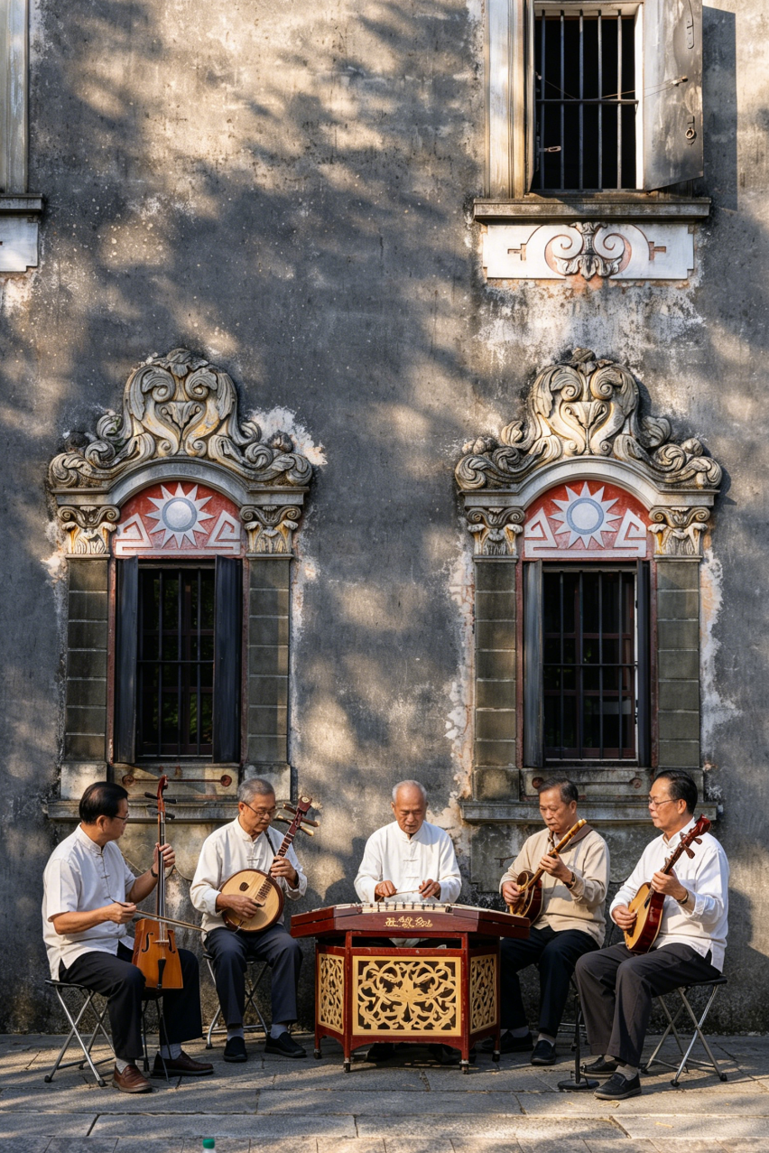 广东音乐“五架头”(高胡、椰胡、扬琴、洞箫、秦琴)现场演绎经典曲目。琴音绕竹,别具岭南韵味。