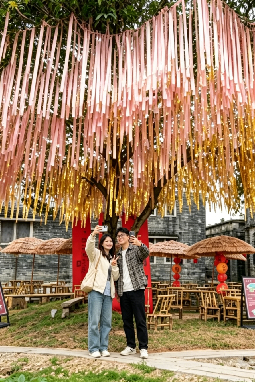 芒果树流苏: 百年芒果树下,金粉混色流苏帘随风轻摆,与青砖碉楼、稻田形成“古今碰撞、冷暖对比”,风起时唯美如画。