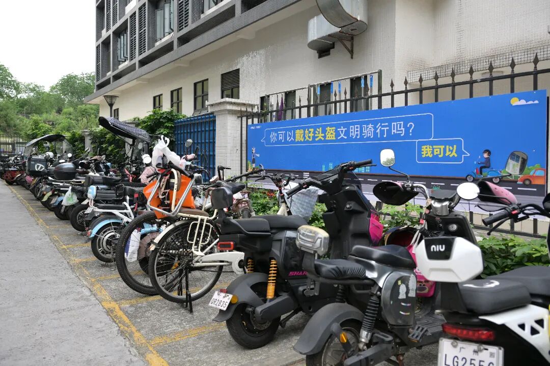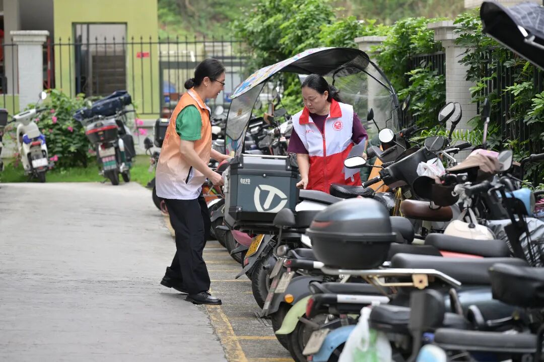 社区志愿者整理电动自行车,并向居民派发文明出行宣传单