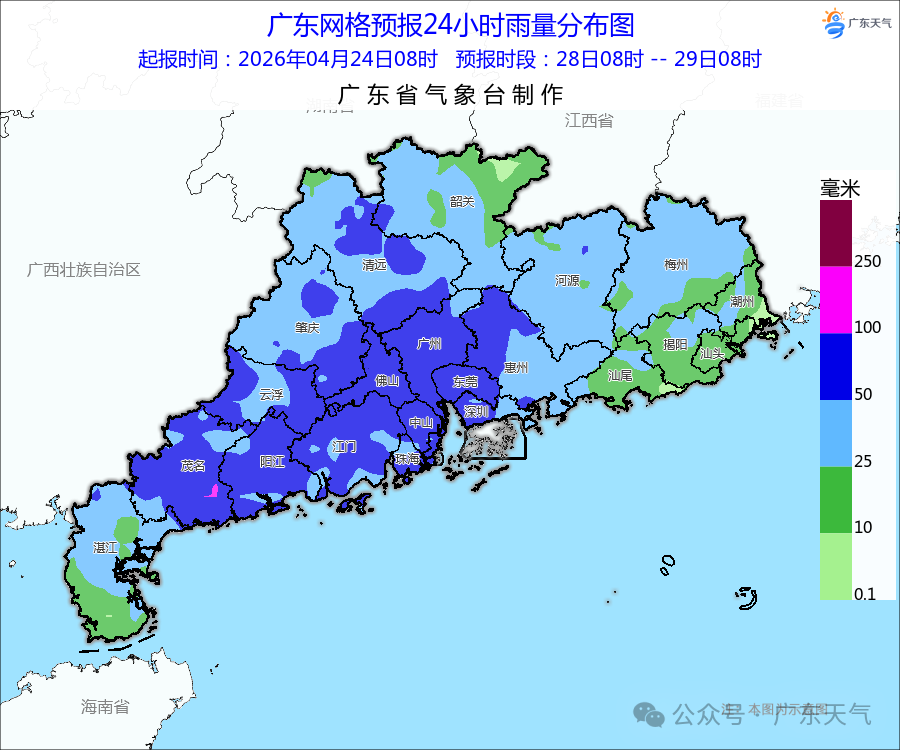 今天(4月24日),冷暖气流在广东沿海交汇,因此考虑南部市县仍有明显降雨;25-26日,雨带(对应切变线系统)东移出海,广东大部降雨逐渐减弱,阳光回归。
